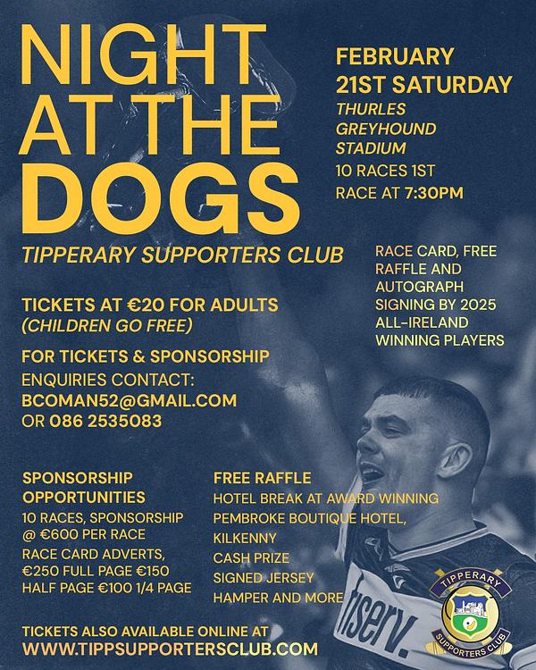 Itβs a big day for Tipp supporters β and why not keep it going? Join us straight after the Tipperary v Limerick match in Semple Stadium for a fantastic Night at the Dogs in Thurles Greyhound Stadium.